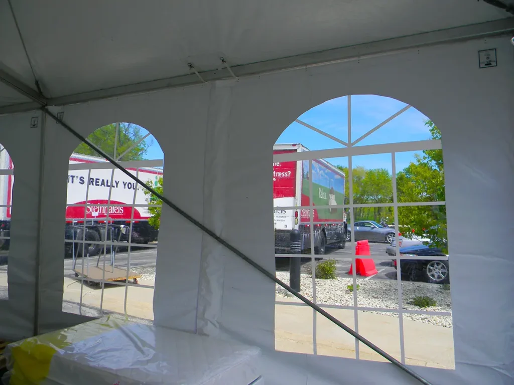 Arched cathedral windows give tents a more traditional, decorative look while still letting light in. They are commonly used for weddings, formal events, and community gatherings where a classic window pattern enhances the overall feel. JK Rentals can mix cathedral windows with solid or clear sections so you get the right balance of style, privacy, and daylight.
