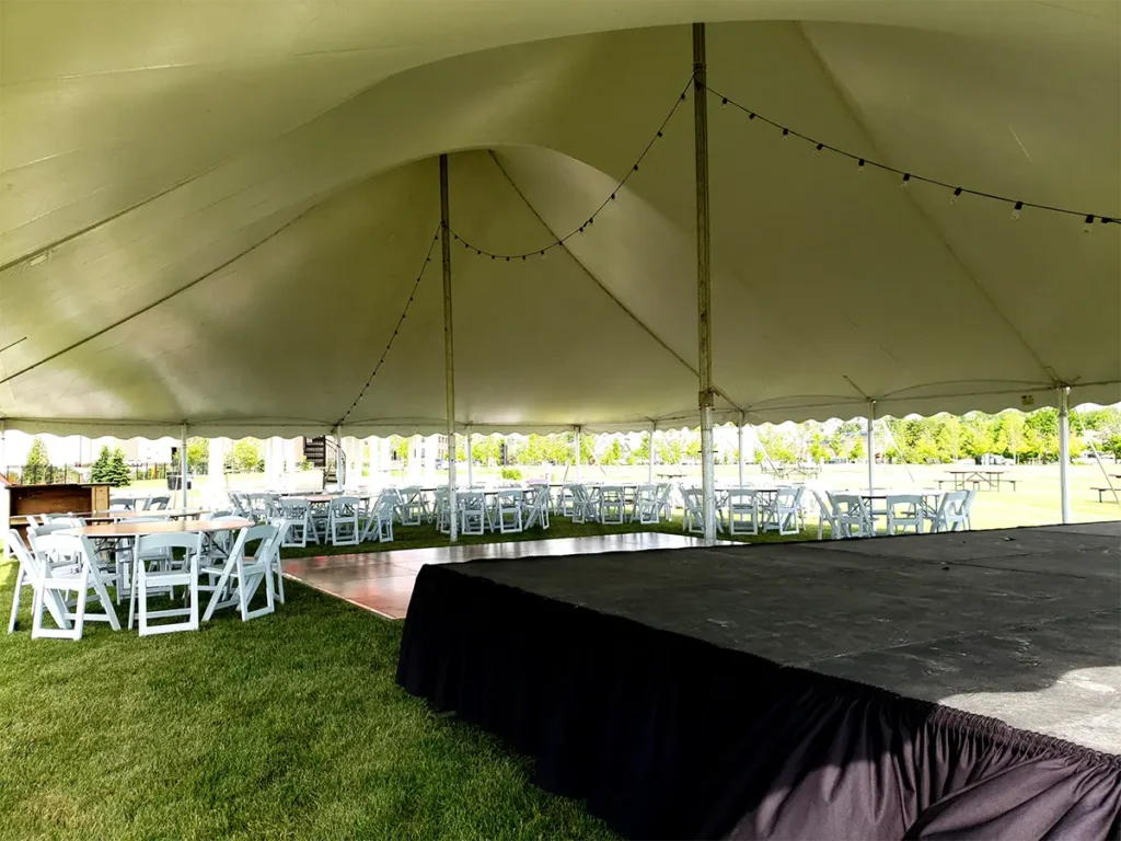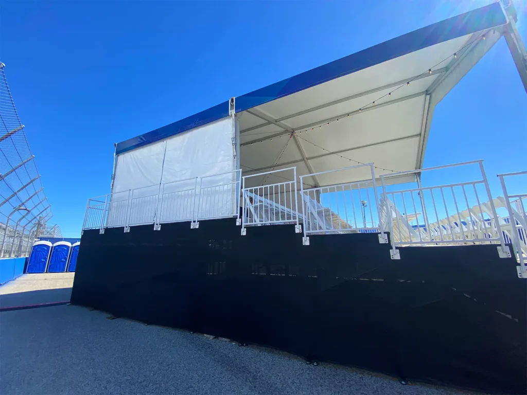 Staging platforms support presentations, performances, production control, and work areas. We configure stages in various heights and footprints, with optional skirting, access points, and backdrop or AV integration. Platforms are configured around tent structure, door placement, and sightline requirements to maintain performance and visibility.