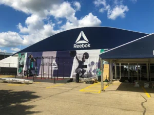 Yes. Arcum clearspans can be finished with glass or vinyl walls, branded panels, liners, doors, and integrated lighting or rigging. Many clients treat the Arcum as a branded environment, layering in signage, decor, and production elements so the structure feels like a custom venue rather than a temporary tent.