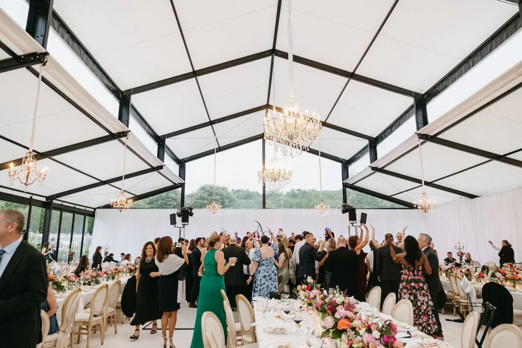 Clear roof panels and premium enclosures transition beautifully from bright daytime ceremonies to warm evening receptions.