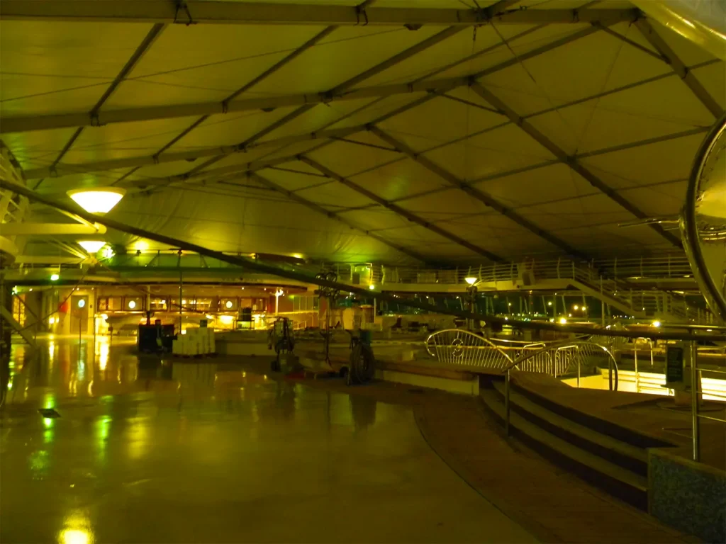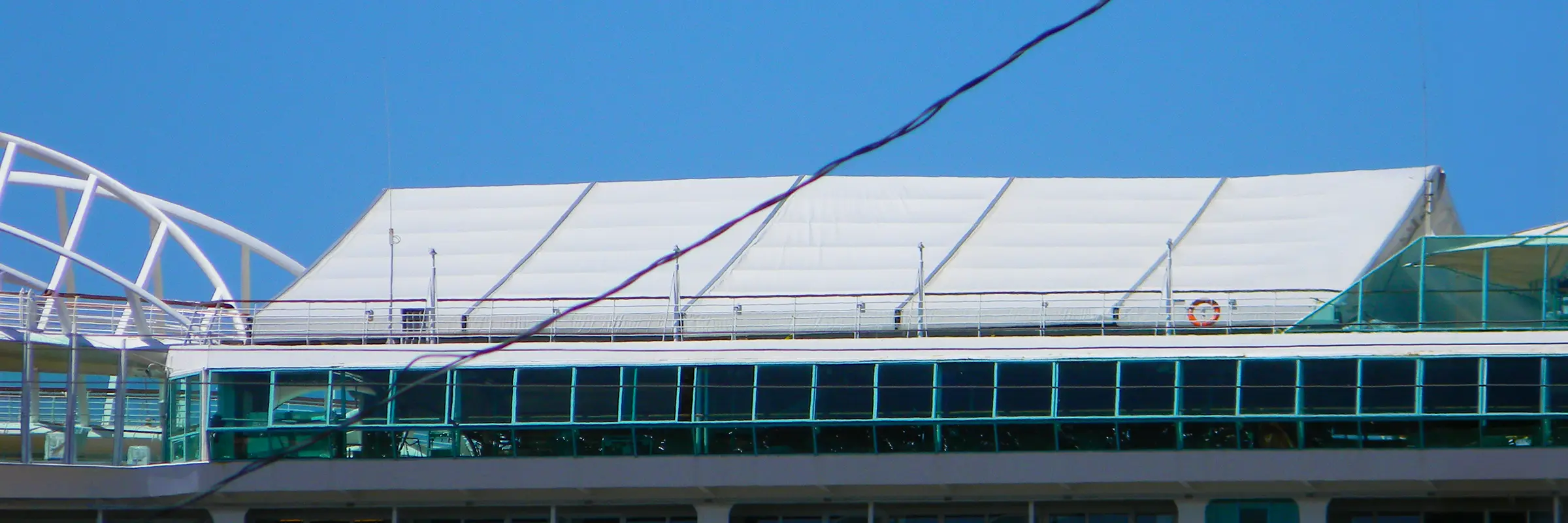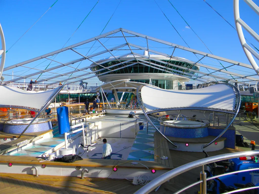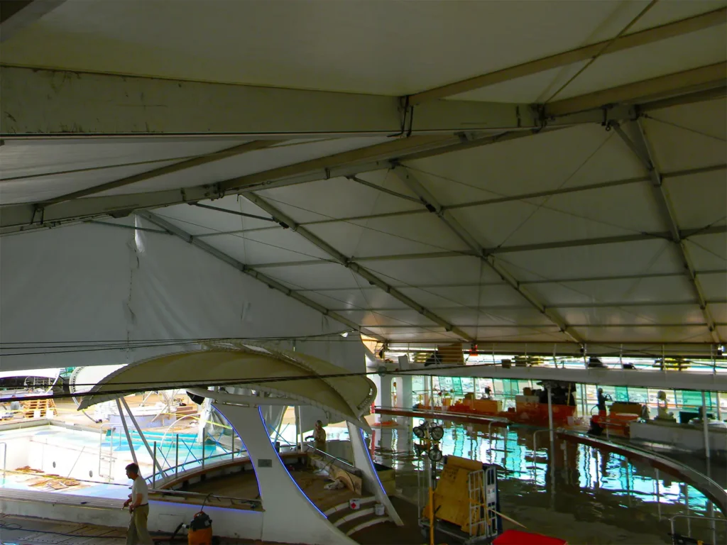 Weather-protected clearspan enclosures supporting shipboard pool-deck renovations.