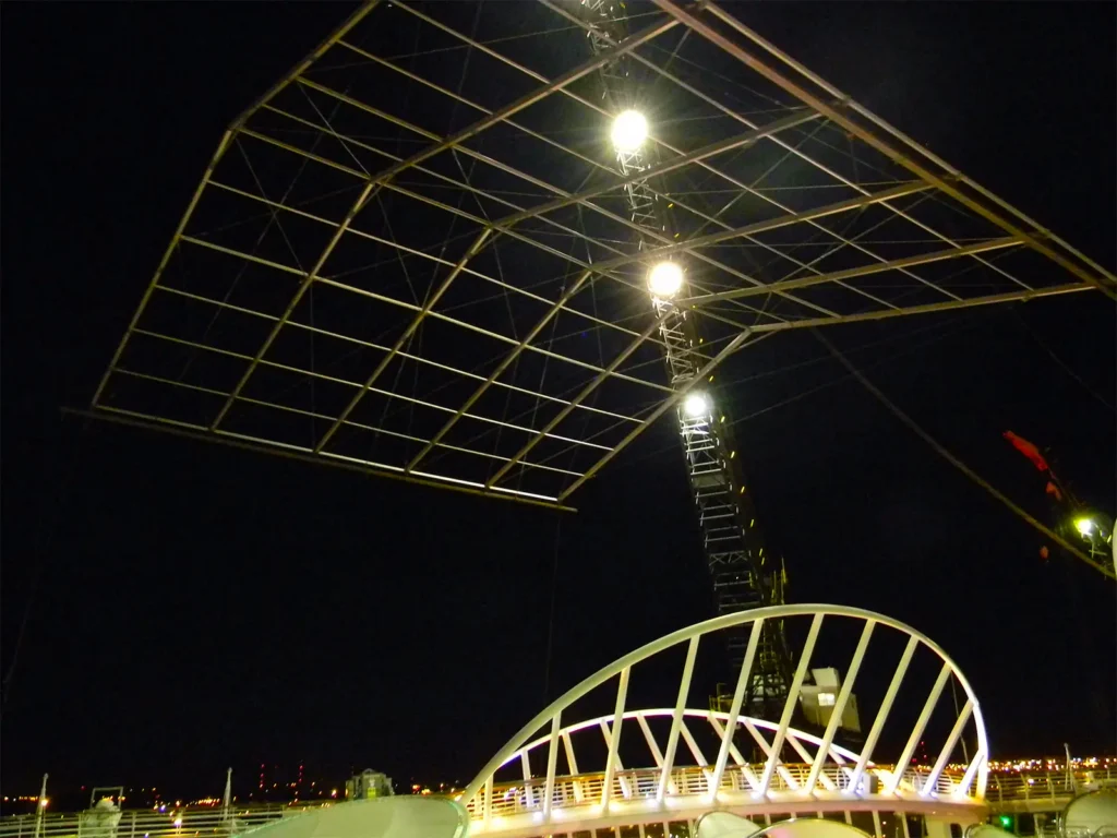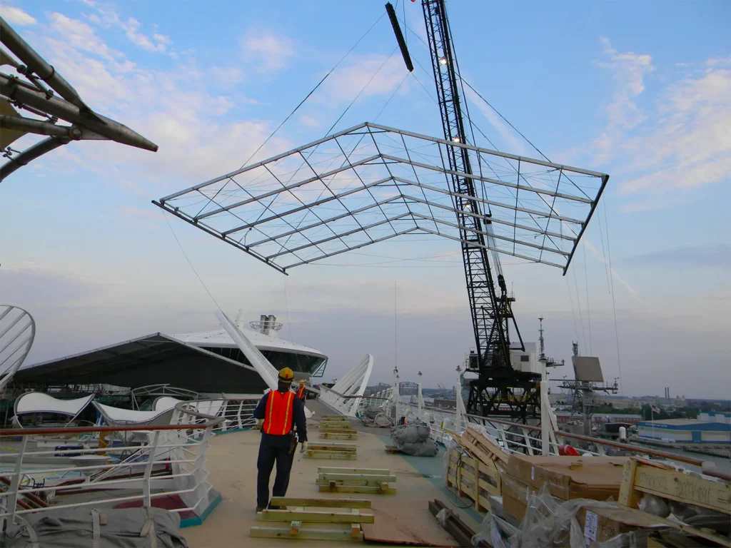 Shipboard installation introduced constraints not found on traditional job sites. With no ability to stake or rest on the deck, the team developed custom mounting and suspension methods to safely secure the structures.