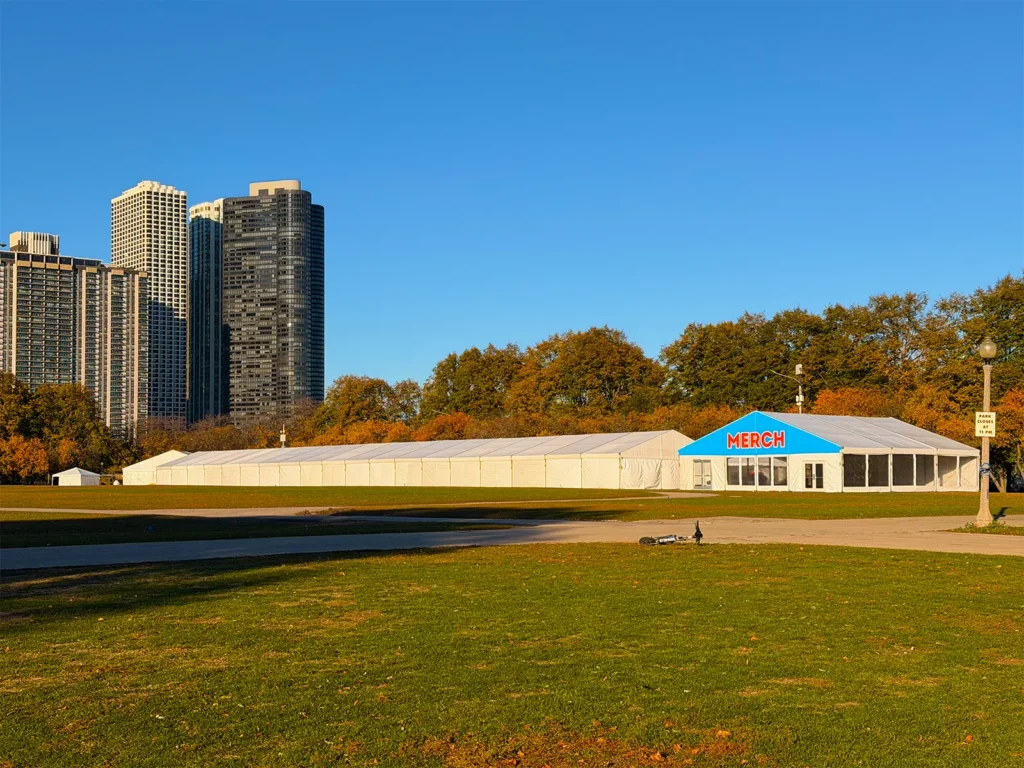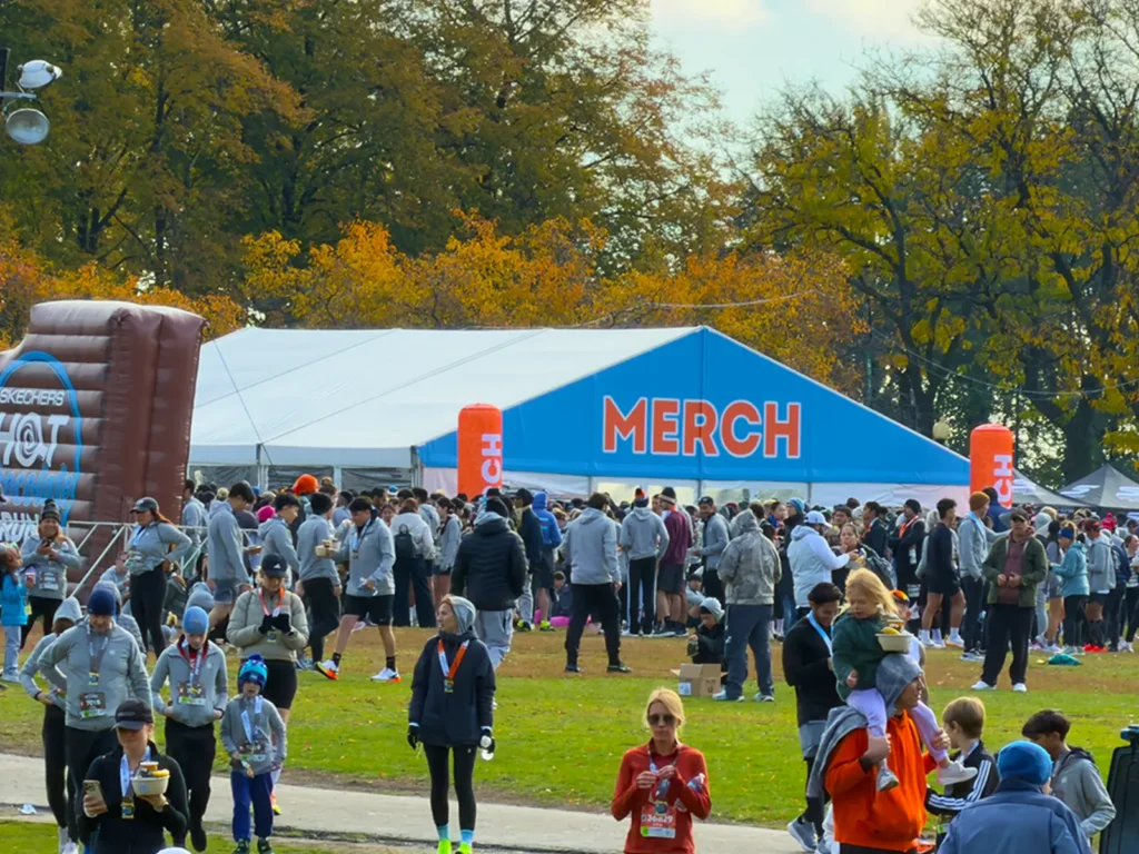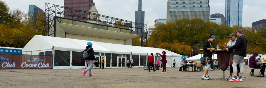The SKECHERS Hot Chocolate Run in Chicago transforms Grant Park into a high-traffic race and post-race experience with multiple operational zones running in parallel. JK Rentals supported the build with tent coverage and infrastructure in key areas, including VIP and Cocoa Club, medical, gear check, volunteer, merchandise, command, and catering zones.