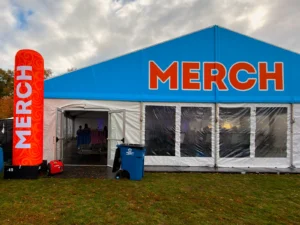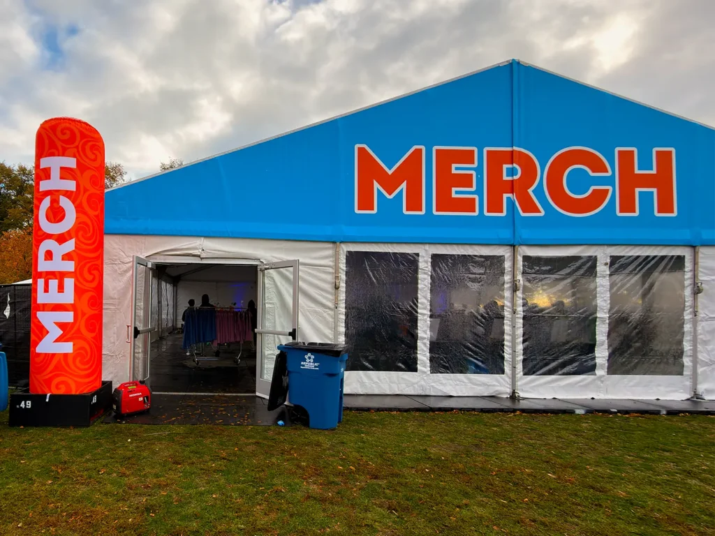 Working with JK Rentals has been nothing short of a great partnership as they’ve continued to deliver exceptional tents with tight deadlines, as we have access to certain locations of the park at different times during our build out. During the two weeks onsite for the event, the JK Rental Team has battled wind, rain, snow, and cold temperatures over the past five years. They always put safety first while ensuring deadlines are met. Working with Brandon and Dillon, leading up to the event and during build week, has been a pleasure, as I know I can trust them to get the job done while offering suggestions to enhance the event experience, such as the branding on our Merch Tent and Medical Tents.