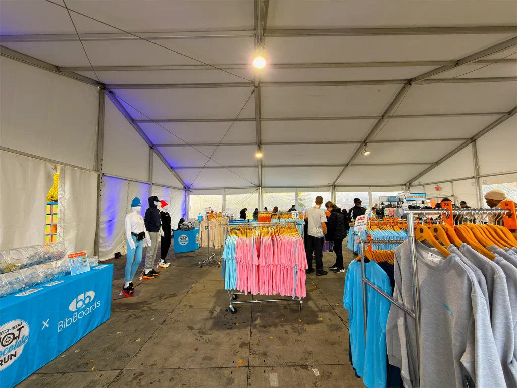 Custom-printed vinyl improved visibility and presented a professional, high-trust presence to participants. Cocoa Club heaters helped maintain comfort and service consistency during early, wet conditions. Dedicated gear check and volunteer support zones helped keep staffing and participant flow organized from arrival through post-race operations. Merchandise and chocolate service coverage supported high-volume guest interaction, with planned wall adjustments to match race-day movement.