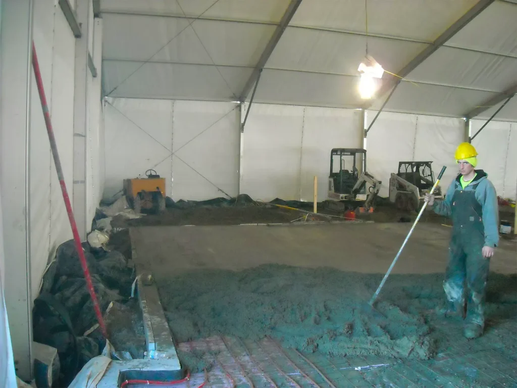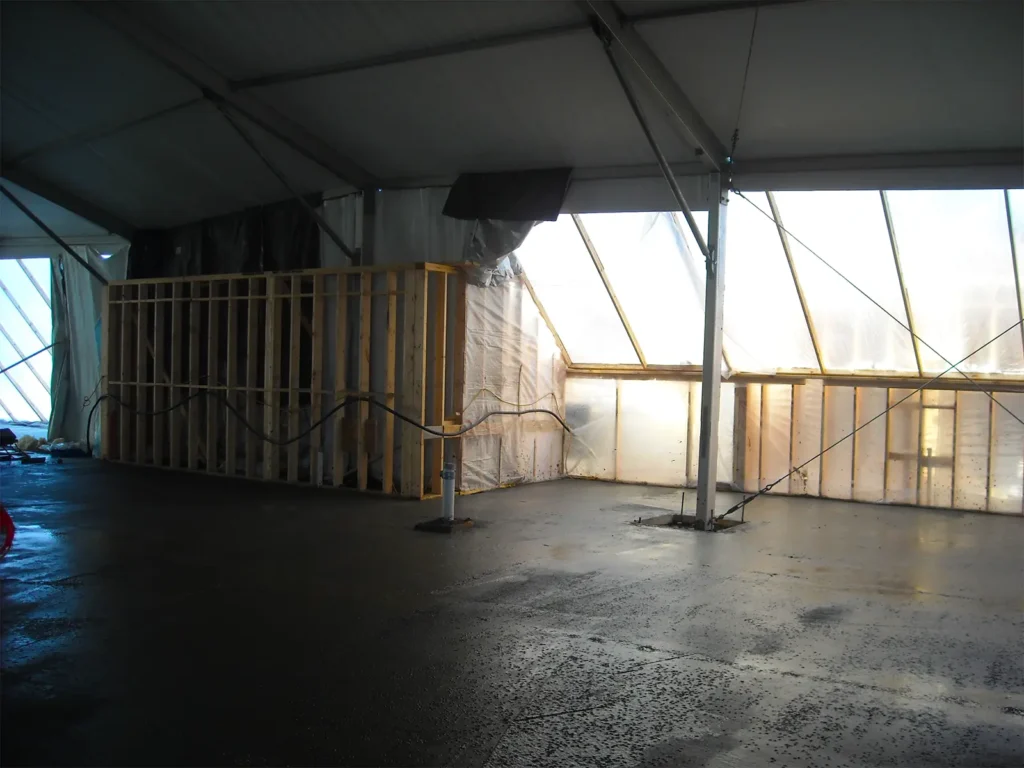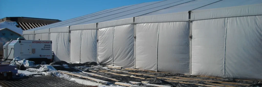 This project combined winter protection with real jobsite flexibility. The enclosure was engineered for cold-weather performance and integrated into an active concrete schedule, including repositioning to match phased work.