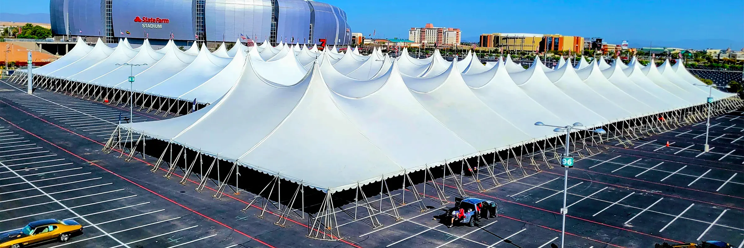 JK Rentals is the nation’s only provider of a 120-foot-wide twin-pole tension tent. With dual 40-foot center poles and a two-peak design, it delivers dramatic scale and coverage for major festivals and expos.